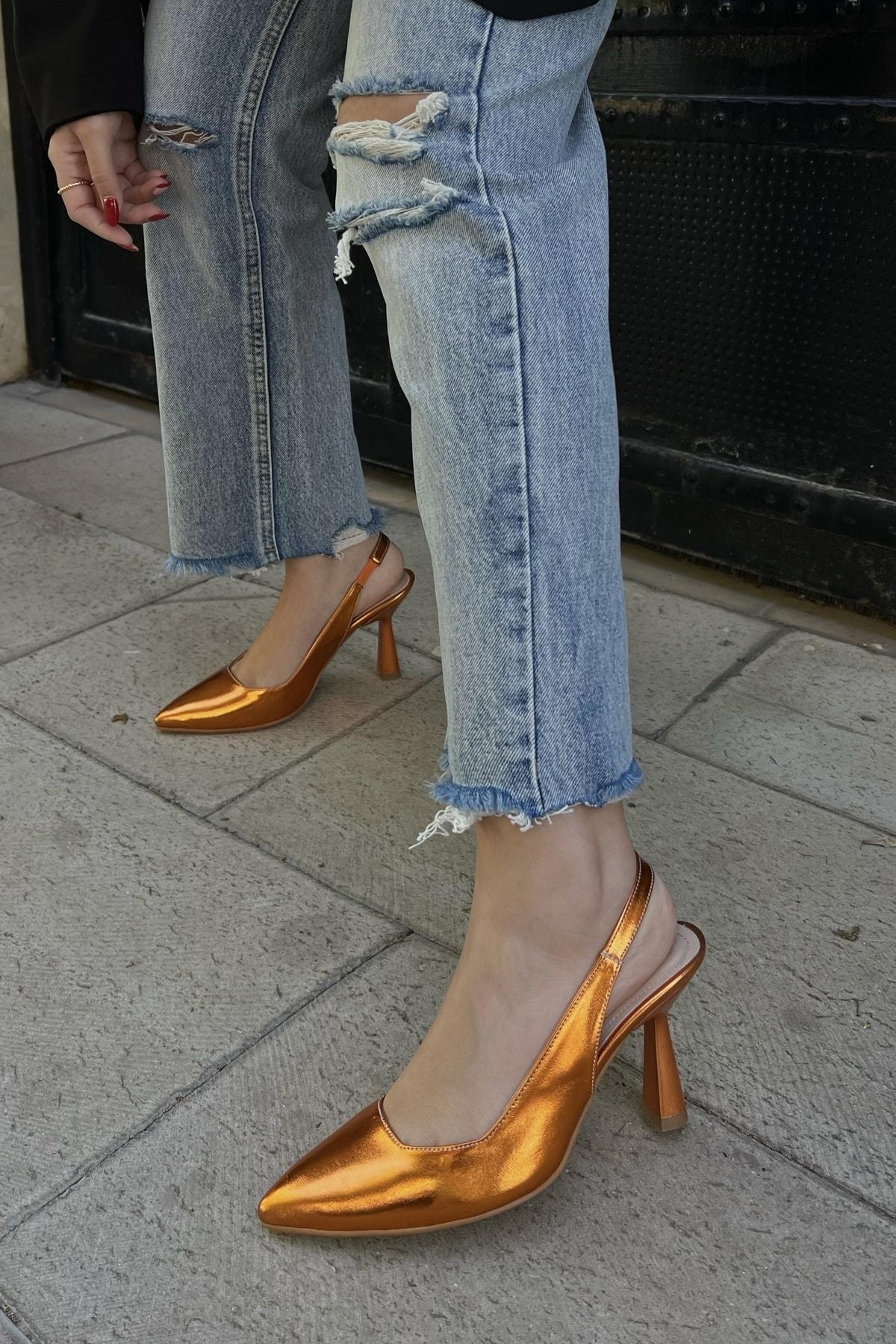 Женские туфли на каблуке с блестками, металлик, бежевый, оранжевый, с острым носком сзади, на открытой шпильке, удобные стильные вечерние модельные туфли 37
