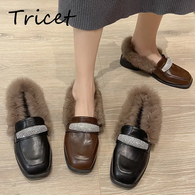 Женские туфли на маленьком каблуке со стразами, зимняя теплая обувь из искусственного меха, женская черная коричневая обувь, модная обувь н...