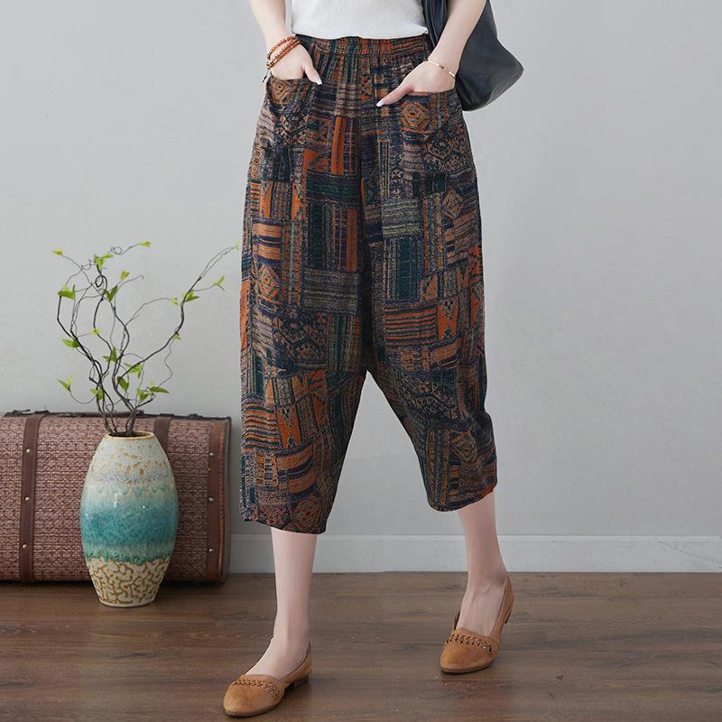 Женские хлопково-шелковые брюки-фонарики с цветочным принтом и эластичной талией - Летние повседневные пляжные брюки длиной семь восьмых для мам среднего и пожилого возраста XL
