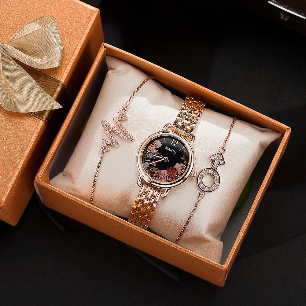 Женские часы-браслет из 3 предметов, подарочная коробка + модные новые часы, женские винтажные часы с цветком розового золота золотой