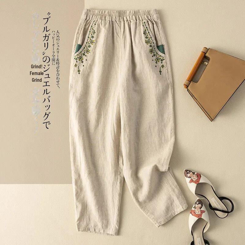 Женские шаровары из хлопка и льна с вышивкой в стиле ретро — коллекция Лето 2024, свободный крой, универсальные, длина девять точек для весны и осени M
