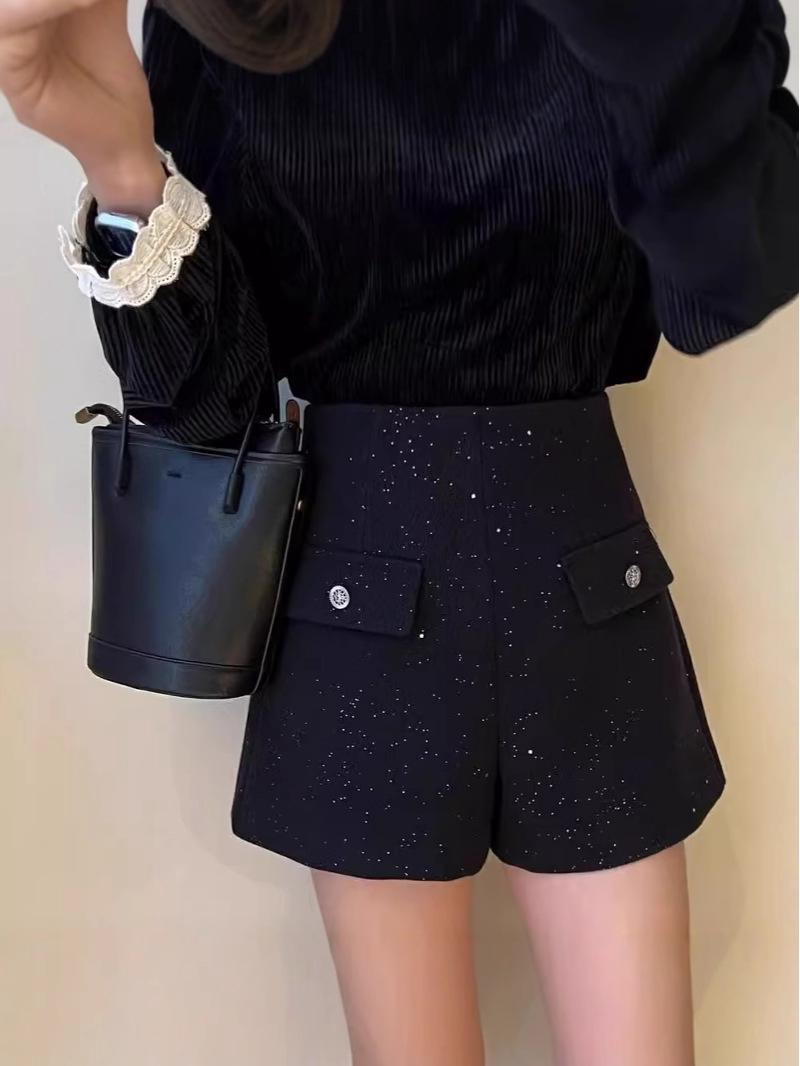Женские шерстяные шорты А-силуэта с высокой посадкой и пайетками - Коллекция Осень/Зима 2024 S чёрный