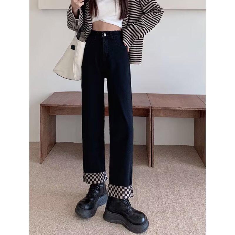 Женские эластичные джинсы с высокой талией в клетку с плюшевым начесом для осени/зимы 2024 Large чёрный