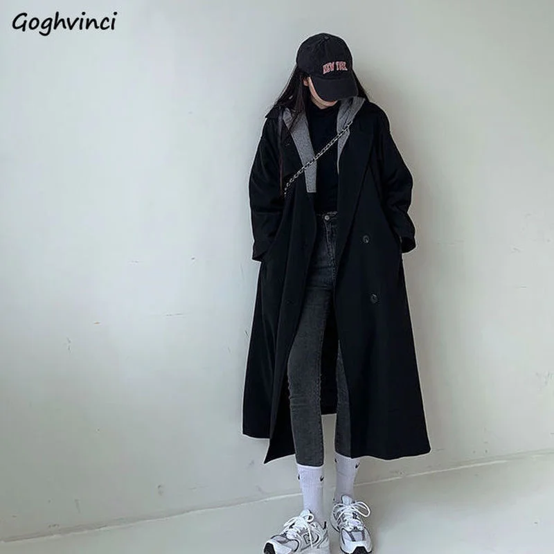 Женский Тренч с капюшоном в стиле пэчворк, молодежная черная трапециевидная уличная одежда в Корейском стиле, новинка, осенняя двубортная и...