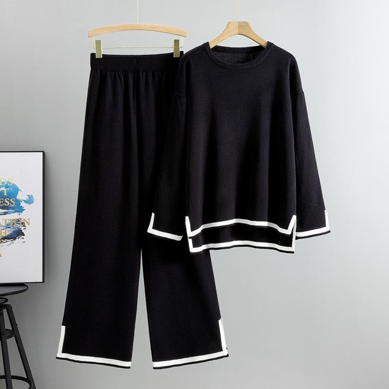 Женский вязаный костюм осень/зима: Комплект из двух предметов: свитер с длинными рукавами и широкие брюки с разрезами One Size чёрный