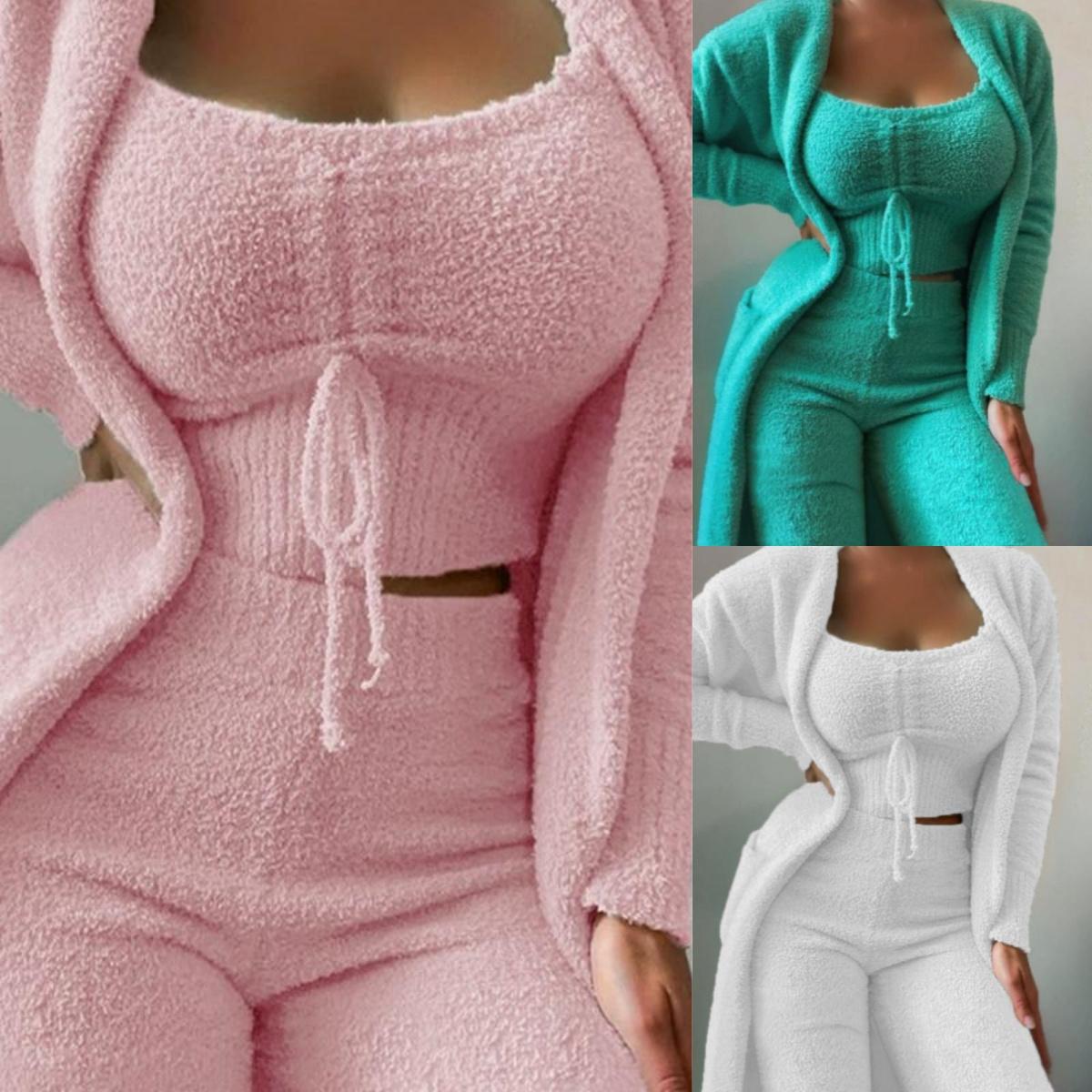 Женский комплект пижамы осень-зима из плюша, укороченный топ + длинные брюки + пальто, комплект из 3 предметов, теплая мягкая флисовая домашняя одежда, пижамный костюм XXXL белый