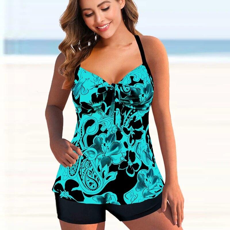 Женский купальный костюм с лямкой на шее, купальник из двух частей, купальный костюм, танкини с цветочным принтом, топ, шорты для мальчика, одежда для купания, S-6XL