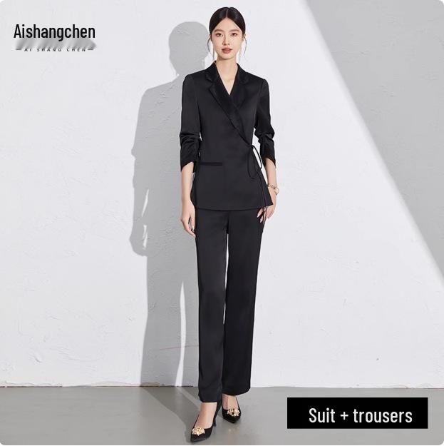 Женский модный костюм черного цвета с текстурой сатина - Весна/Осень, в китайском стиле, профессиональная формальная рабочая одежда S