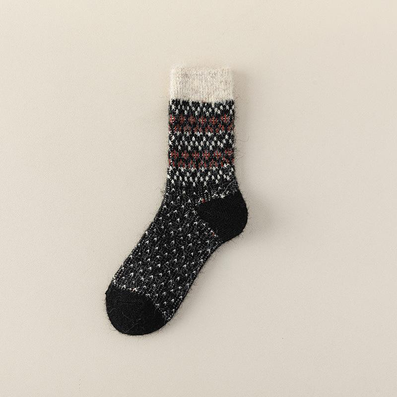 Женский осенне-зимний стиль, утолщенные бархатные теплые ретро этнические шерстяные носки-бочонки 1 pair чёрный/белый