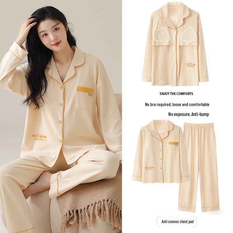 Женский пижамный комплект больших размеров из чистого хлопка с длинным рукавом и нагрудными вкладышами - Высококачественная домашняя одежда для весны/осени Extra Extra Large