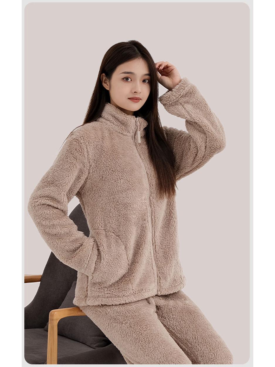 Женский пижамный комплект из облачного кораллового флиса - Осень/Зима 2025, Фланель с высоким воротником и плюшевым вельветом Large света кофе