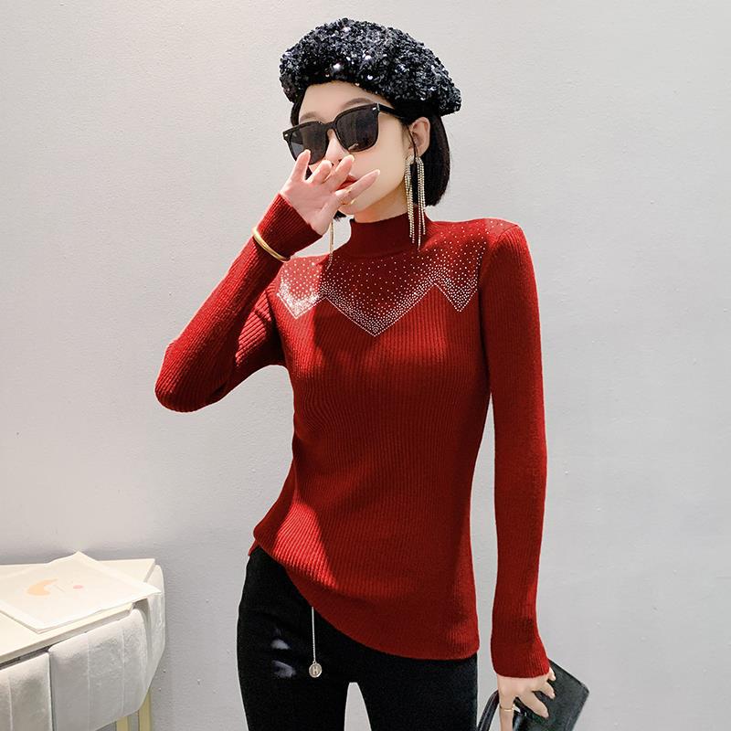 Женский пуловер с высоким воротником в стиле пэчворк в европейском стиле с дизайном из горячих страз - Универсальная мода для осени и зимы One Size красный