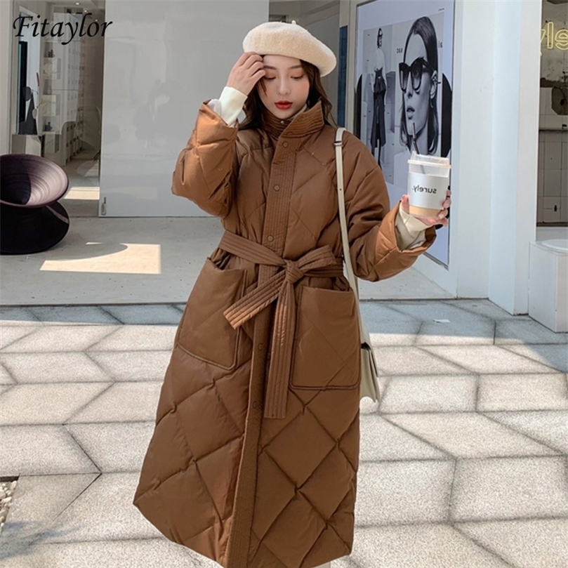 Fitaylor Winter Women Parka Windproof Stand Collar White Duck Down Long Coat Thick Warm Black Single Breasted Snow Outwear 201127, Brown