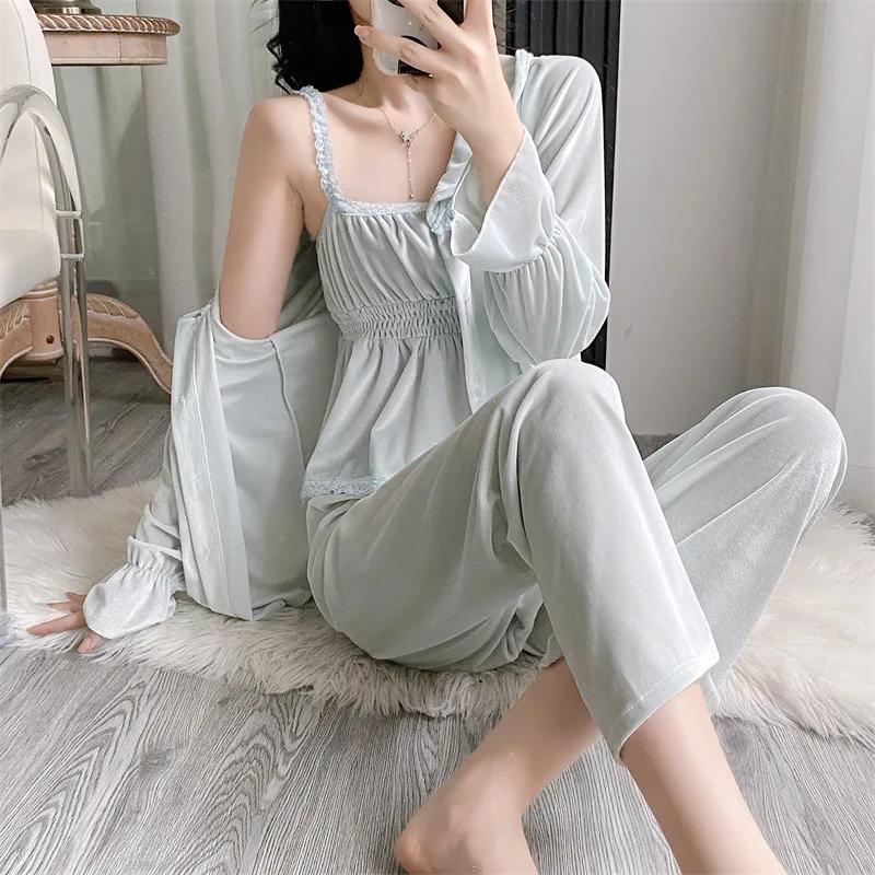 Женский теплый комплект пижам из 3 предметов, ночное белье, осенняя новая золотая велюровая домашняя одежда, сексуальный топ и брюки на бретельках, свободная ночная рубашка, бархатное нижнее белье XL синий