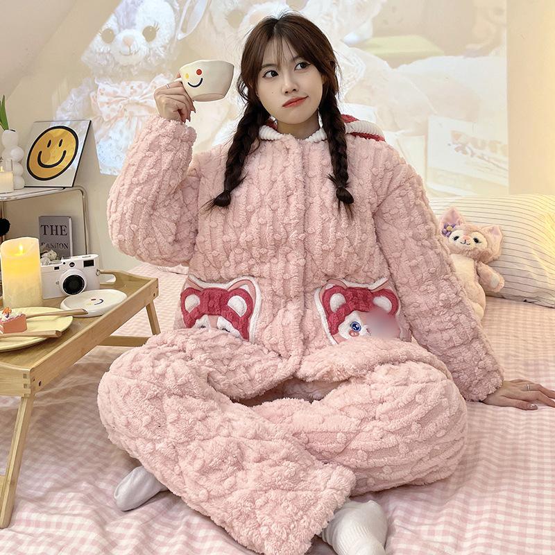 Женский трехслойный стеганый пижамный комплект: Фланелевая куртка с капюшоном, зимняя ночная рубашка, халат и плотные брюки больших размеров. Double Extra-Large