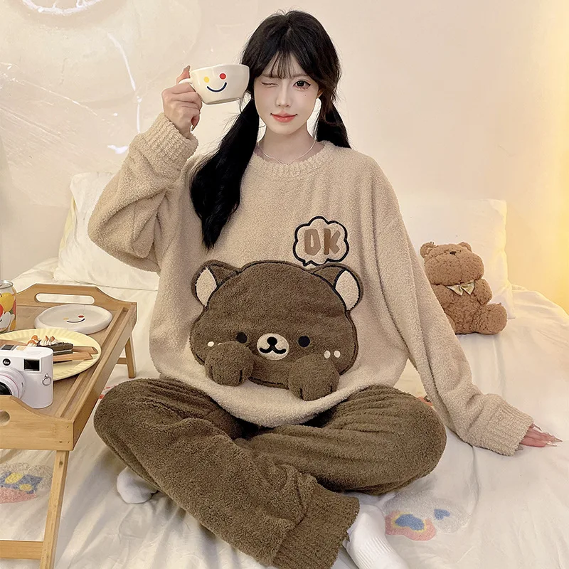 Женский утолщенный пижамный комплект из кораллового флиса, корейская студенческая зимняя теплая домашняя одежда, милая мультяшная мягкая плюшевая одежда для сна, верхняя одежда