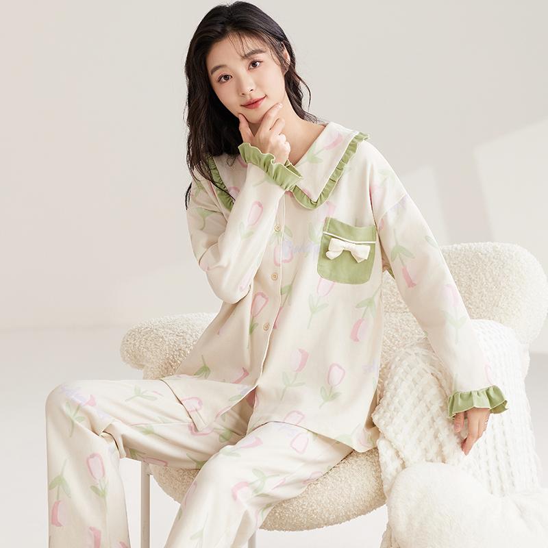 Женский хлопковый пижамный комплект осень-зима с отложным воротником, симпатичная пижама в стиле принцессы, женская домашняя одежда с длинным рукавом 2XL
