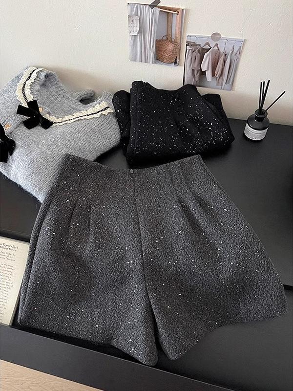 Женский шерстяной костюм с пайетками «Звездное небо»: Брюки широкие от бедра, Шорты-бутоны, Блестящая верхняя одежда S чёрный