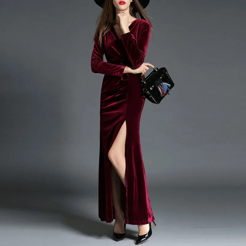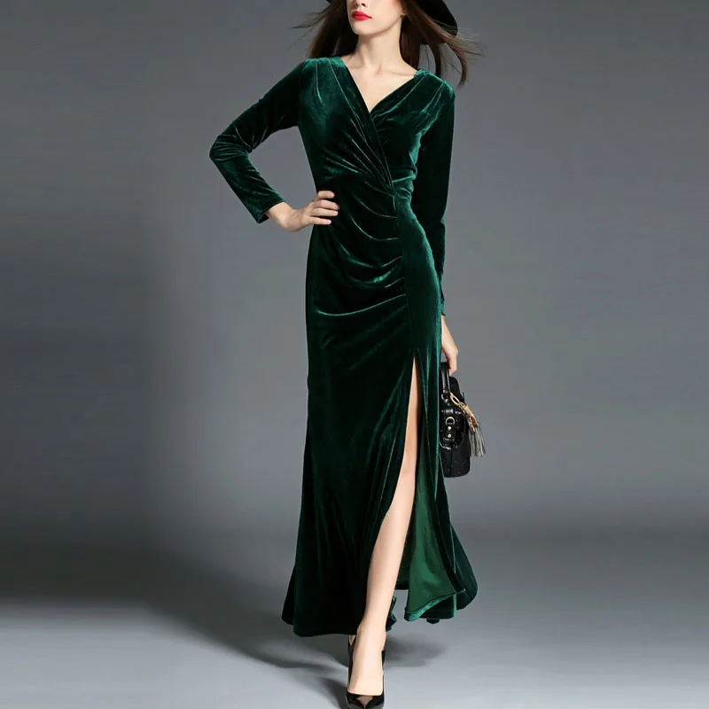 Женское Плиссированное вечернее платье, элегантное Плиссированное бархатное платье с разрезом, V-образным вырезом, в стиле ретро, для выпус...
