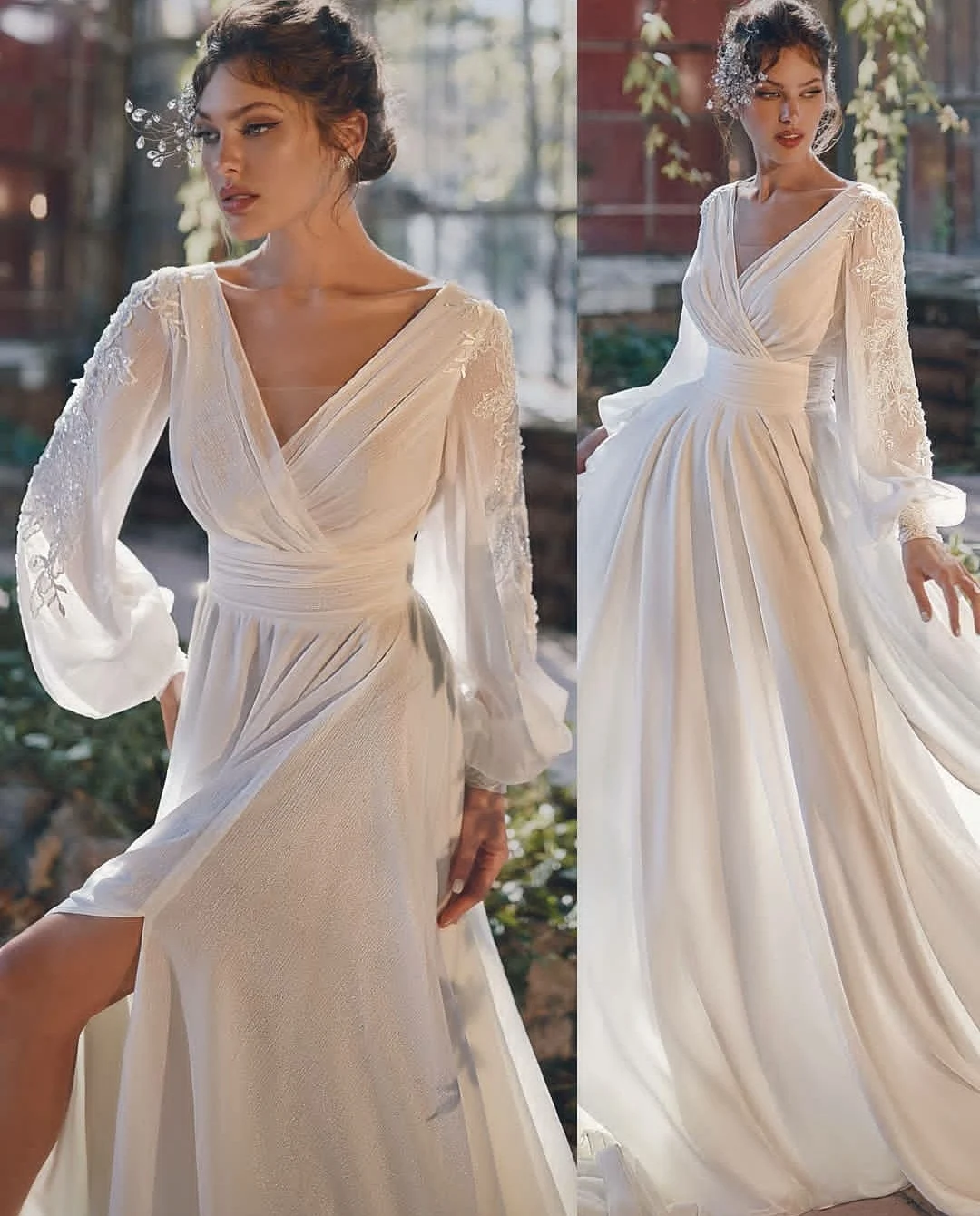 Женское Плиссированное свадебное платье, элегантное шифоновое платье с длинными рукавами, V-образным вырезом, карманами, молнией на спине, ц...