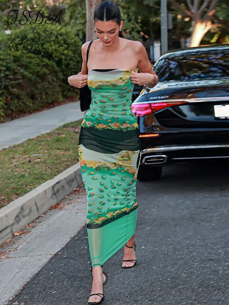 Женское Сетчатое облегающее платье с принтом Y2K, зеленое летнее Прозрачное платье средней длины без бретелек с открытой спиной, Клубные веч...