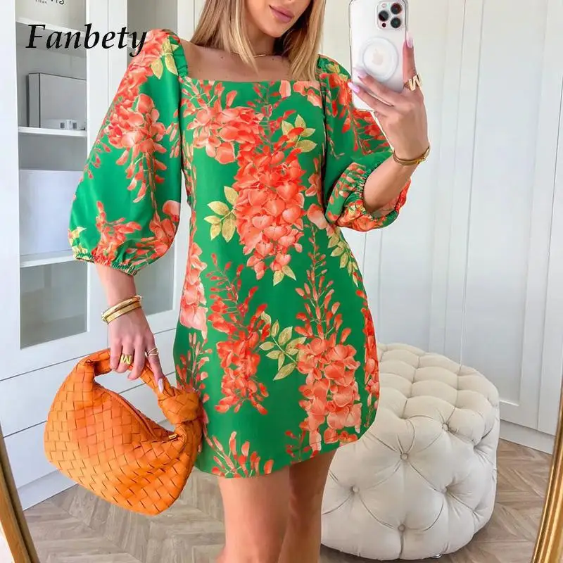 Женское ТРАПЕЦИЕВИДНОЕ ПЛАТЬЕ с принтом, Элегантное повседневное платье с рукавом-фонариком и открытыми плечами, Пляжное Дамское Платье, в...