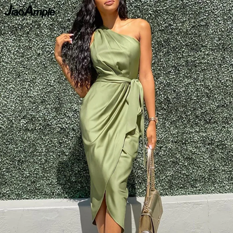 Женское асимметричное атласное платье с косым плечом, Летние Элегантные однотонные платья со шнуровкой, вечернее сексуальное облегающее п...