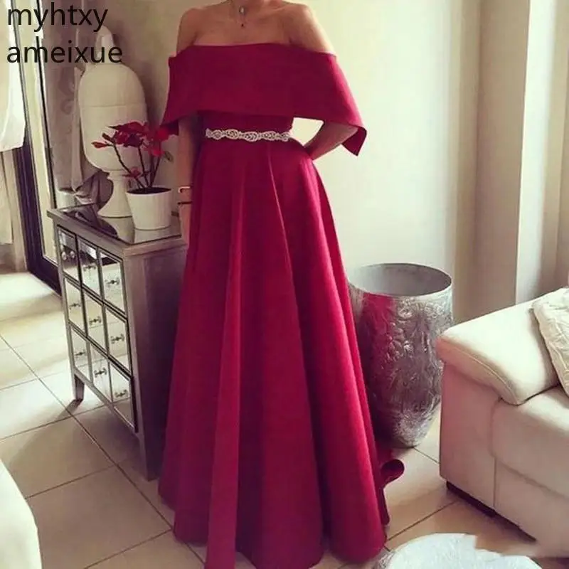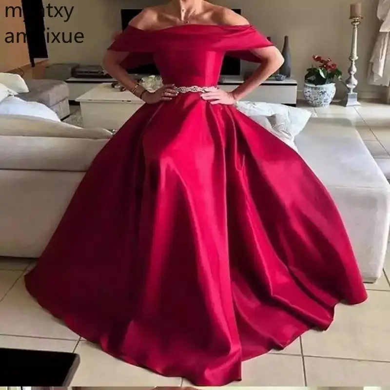 Женское атласное вечернее платье, красное платье с вырезом лодочкой, открытыми плечами, молнией на спине и поясом с кристаллами, весна-лето ...