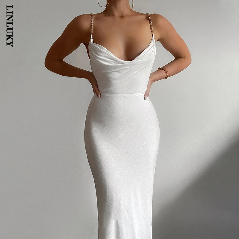 Женское атласное платье на бретельках, летнее модное сексуальное длинное платье с маленьким ворсом и цепочкой для клувечерние НКИ, фестива...