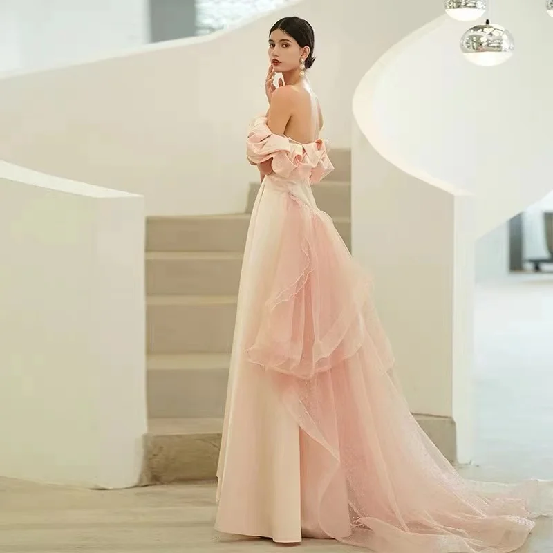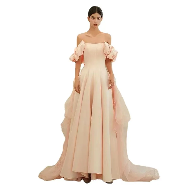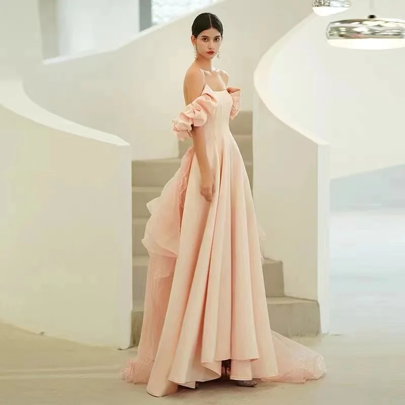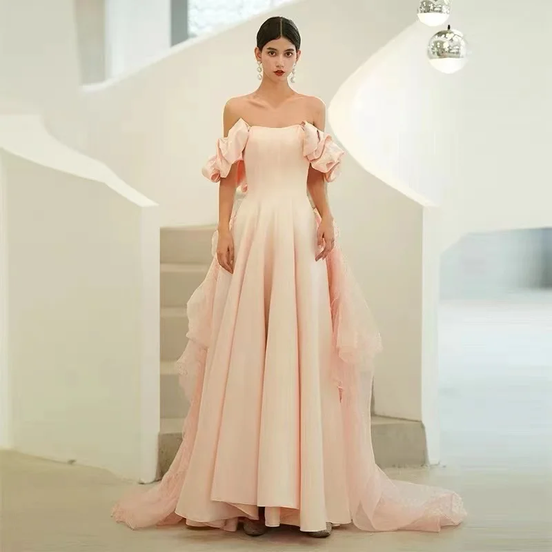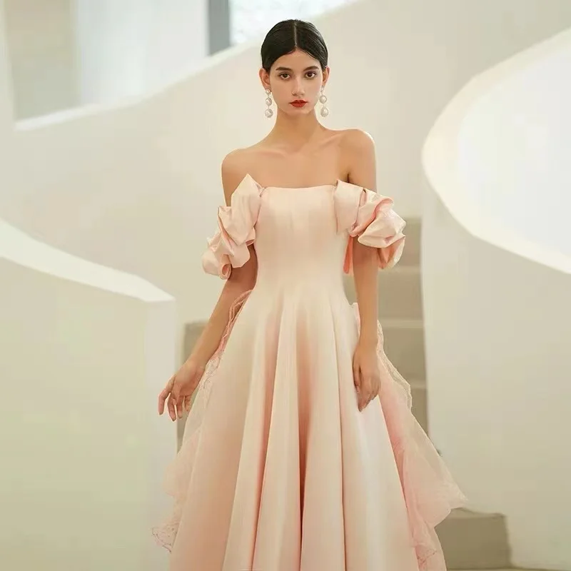 Женское атласное платье с открытыми плечами, розовое платье с вырезом лодочкой и открытой спиной, а-силуэт, с пышными рукавами, вечернее платье, лето 2023