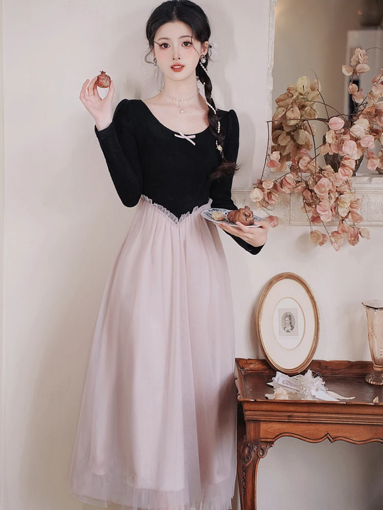 Женское бархатное платье в стиле пэчворк, Черное длинное бархатное Сетчатое платье, элегантное роскошное платье с оборками, винтажные вечерние платья в Корейском стиле, весна-осень 2024