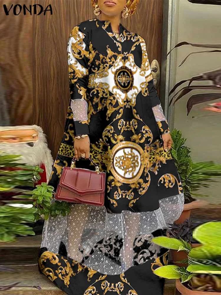 Женское богемное кружевное платье с принтом 2023, сексуальное Сетчатое платье в стиле пэчворк с V-образным вырезом, Вечернее Макси-платье VONDA, платья, женское пляжное платье