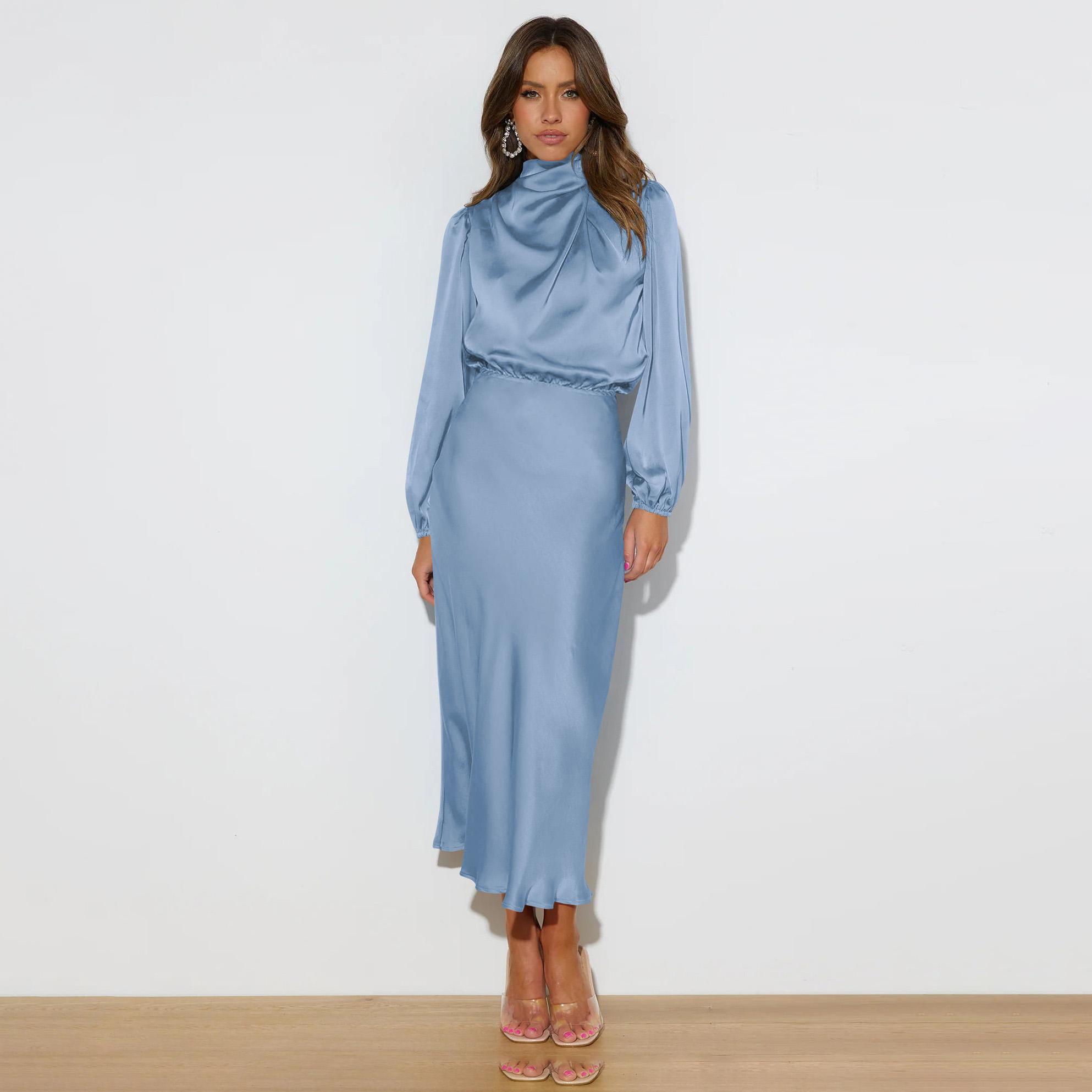 Fashion Splicing Long Sleeve Pullover High Waist Ssolid Color Plus Size Women Long Dress