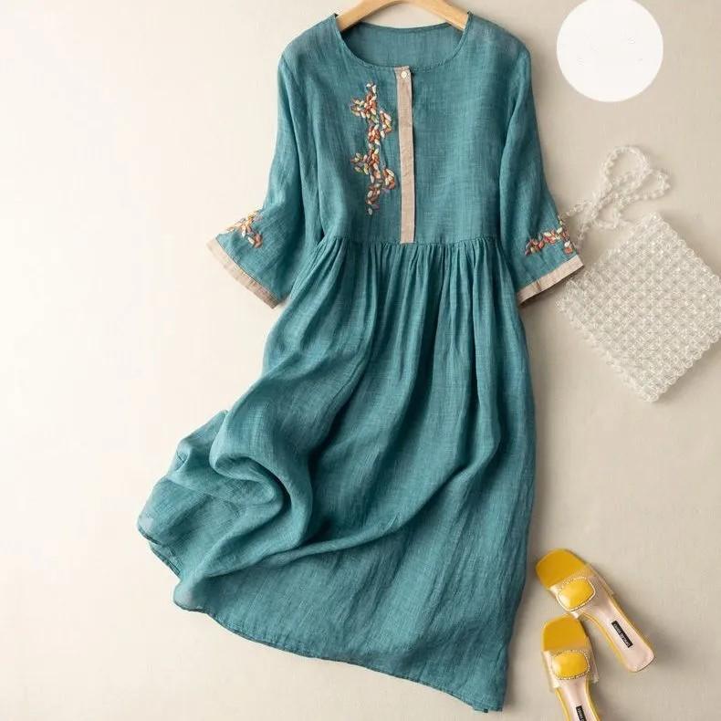 Женское весенне-летнее платье средней длины с вышивкой в литературном этническом стиле, свободные платья со средним рукавом 2XL зелёный