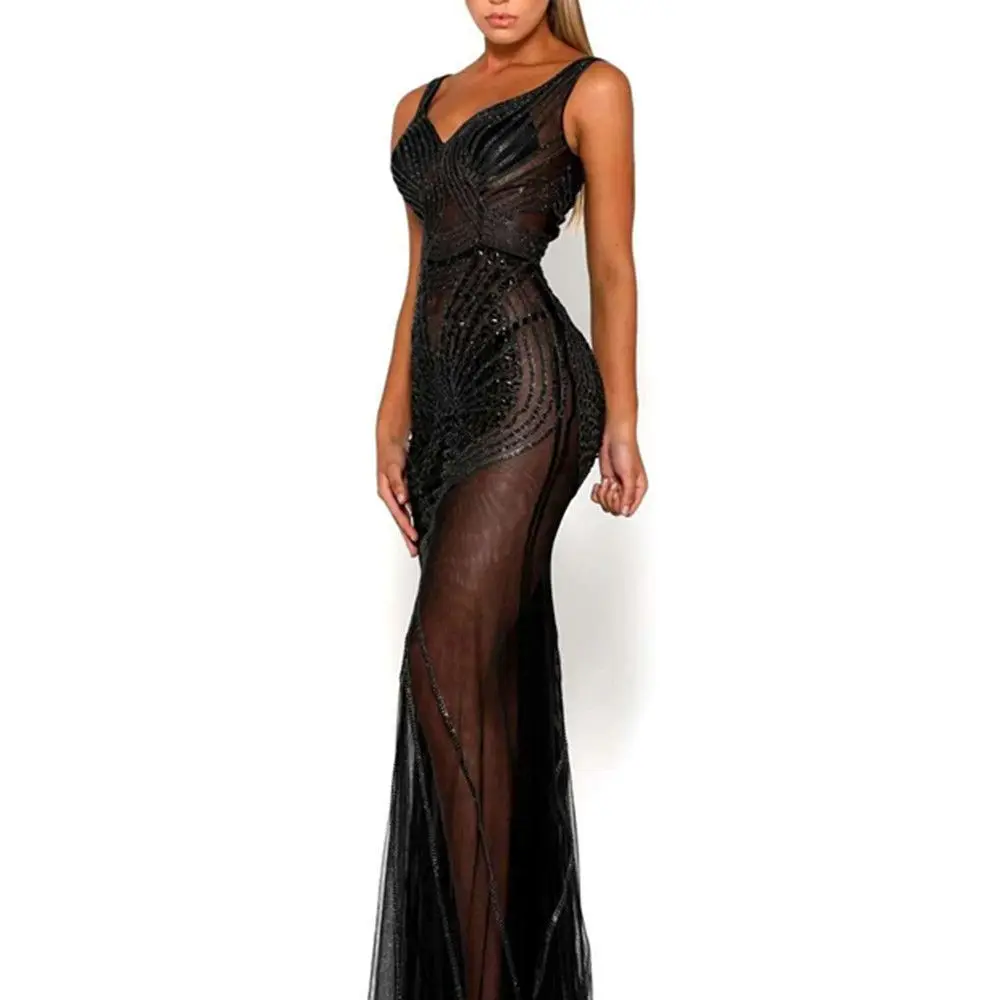 Женское вечернее платье без рукавов, длинное черное платье из прозрачного тюля с V-образным вырезом, расшитое бисером, в стиле звезд, для осо...