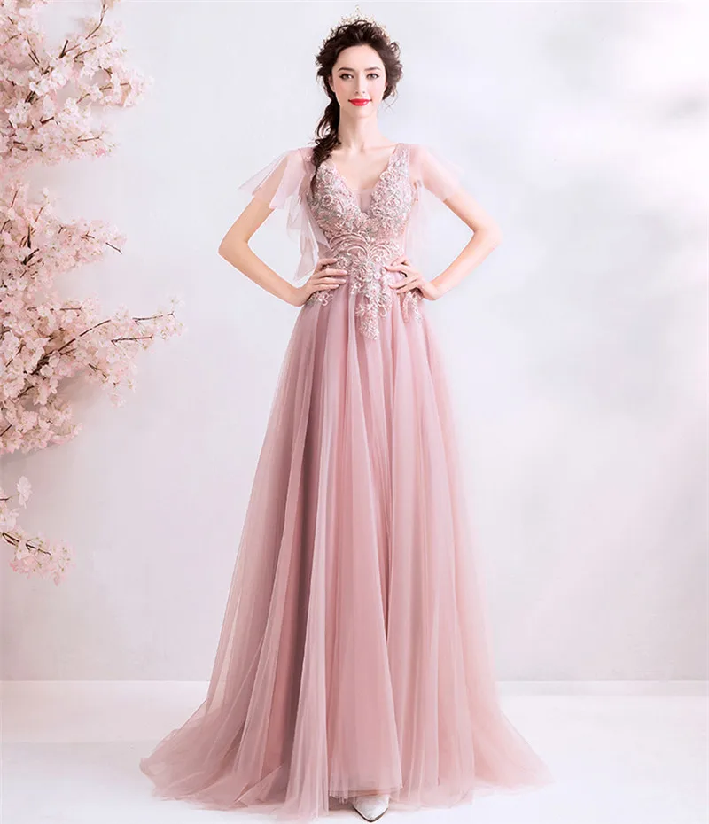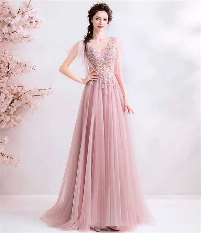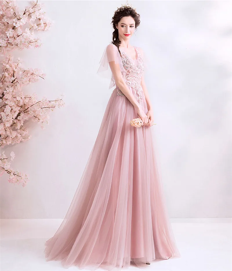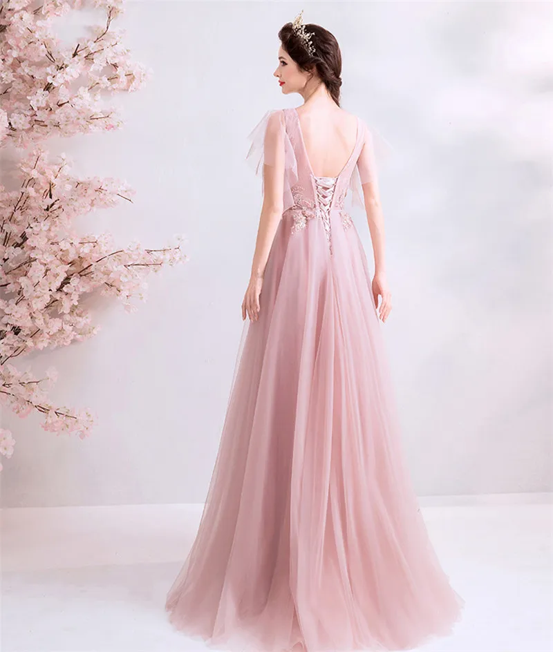 Женское вечернее платье из тюля, розовое ТРАПЕЦИЕВИДНОЕ кружевное платье с открытой спиной и цветочной аппликацией, модель XH394 на лето, 2020