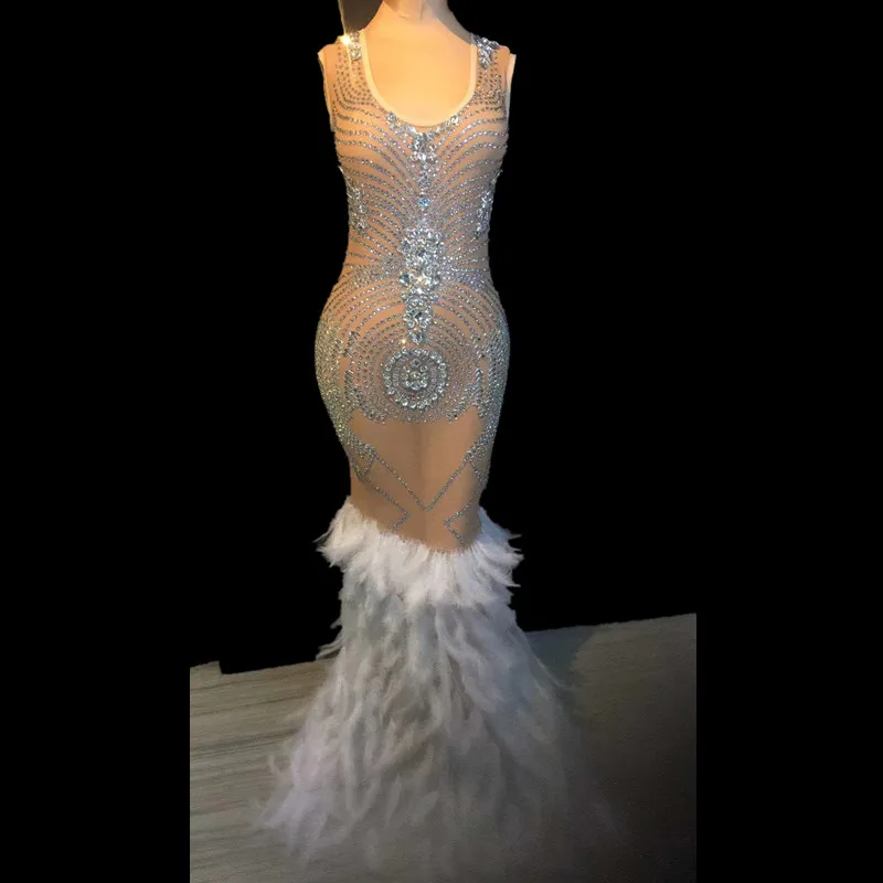 Женское вечернее платье-русалка, длинное платье с перьями, стразы для празднования дня рождения, сценические наряды для певицы