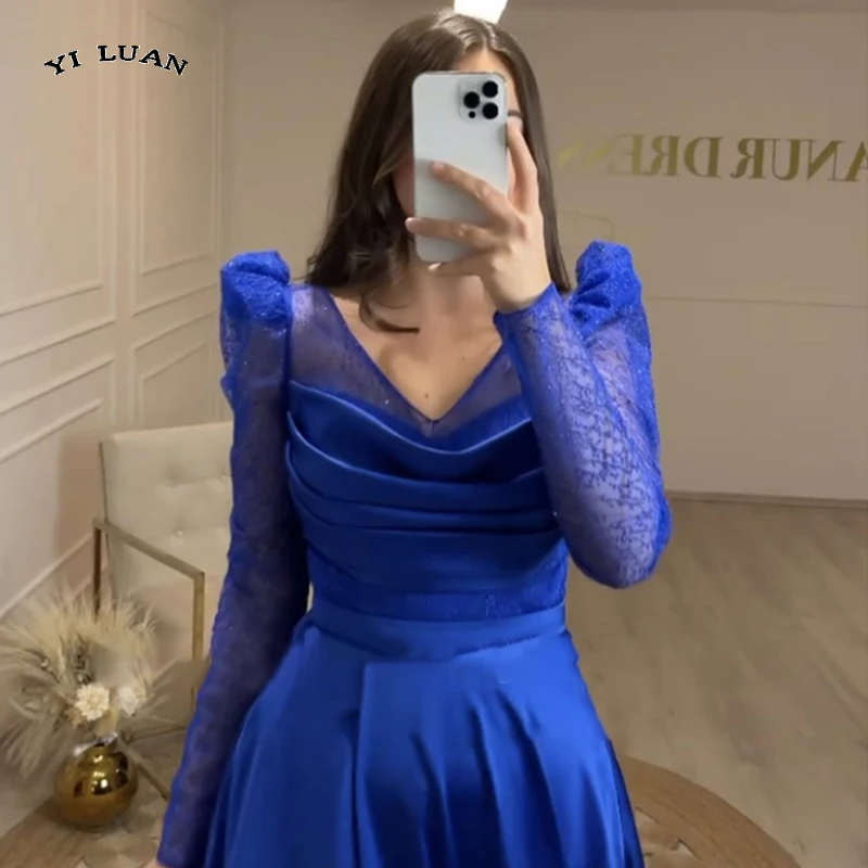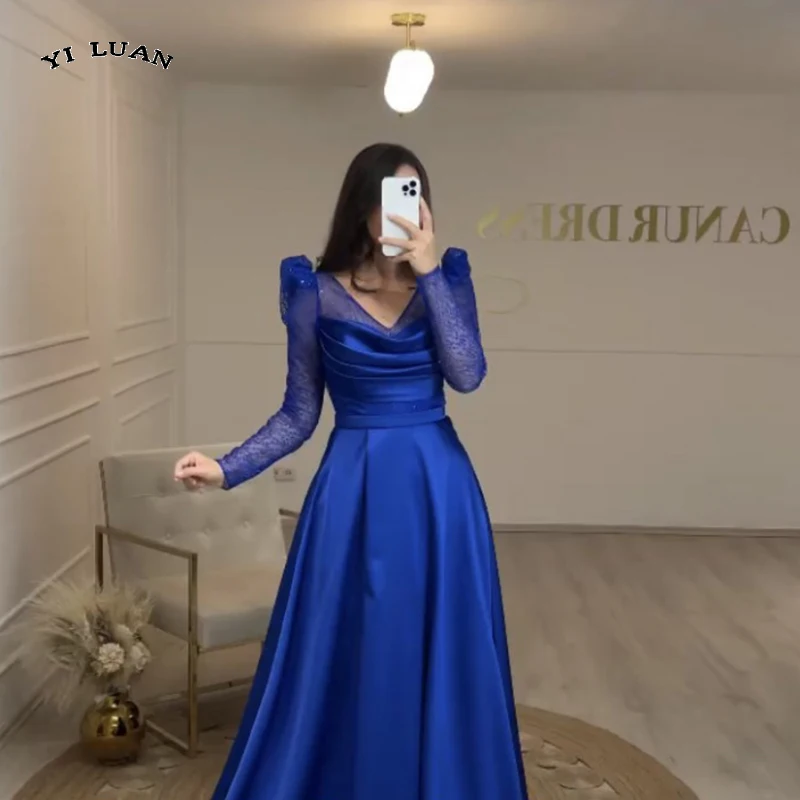 Женское вечернее платье с длинным рукавом, темно-синее атласное платье-трапеция с V-образным вырезом, с разрезом, в стиле Звезд Дубая, для сва...