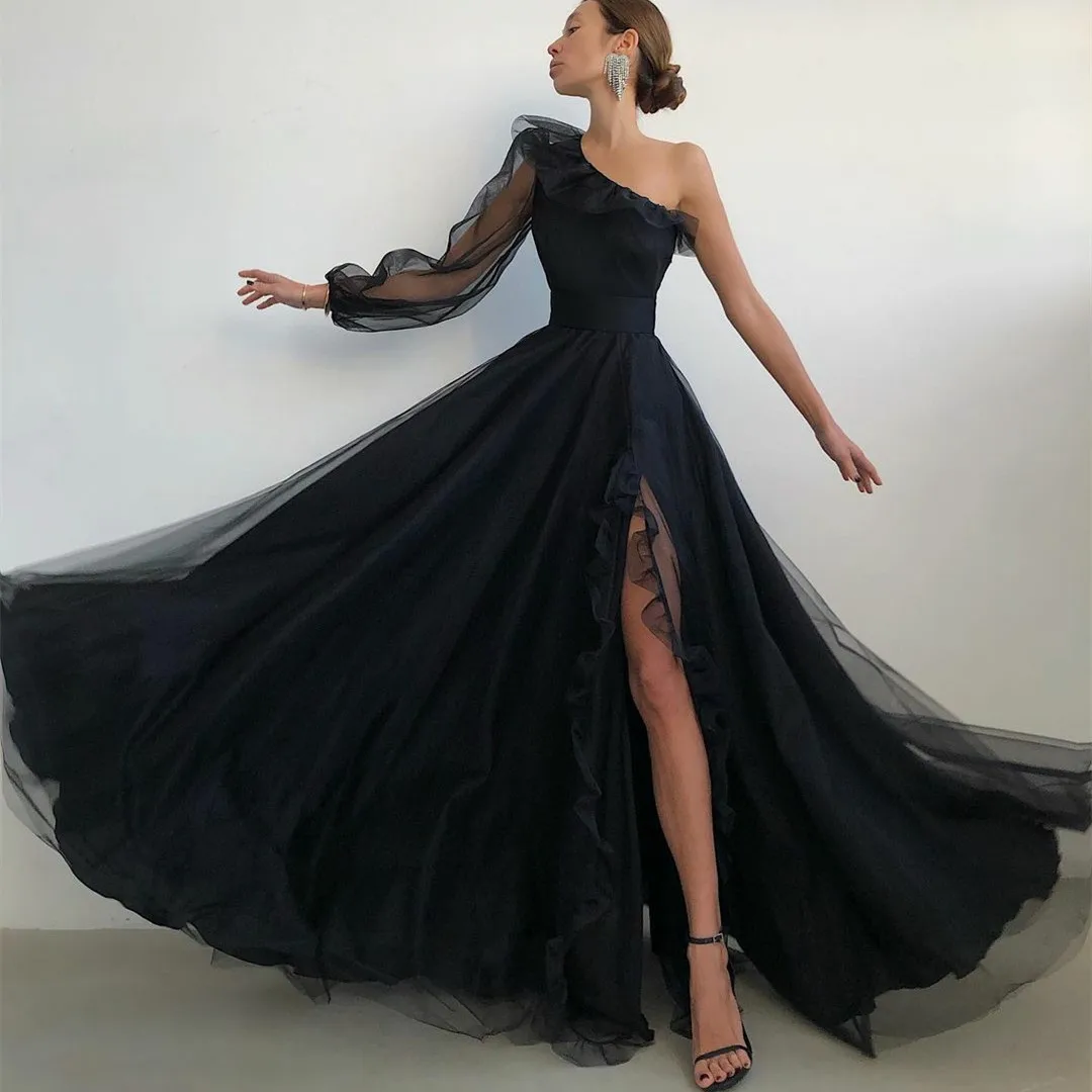 Женское вечернее платье с открытым плечом, черное ТРАПЕЦИЕВИДНОЕ ПЛАТЬЕ ИЗ ТЮЛЯ в стиле ретро, с разрезом, для выпускного вечера