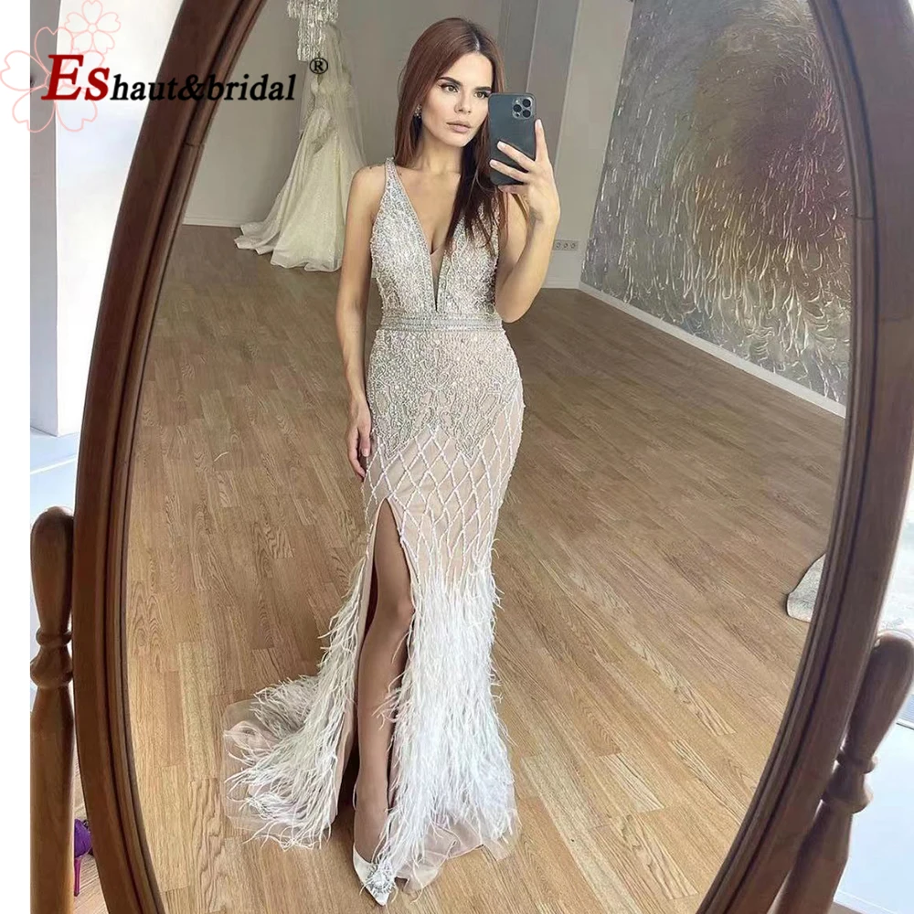 Женское вечернее платье с юбкой годе, элегантное платье с перьями, V-образным вырезом, без рукавов, с бусинами и Боковым Разрезом, Формальные ...