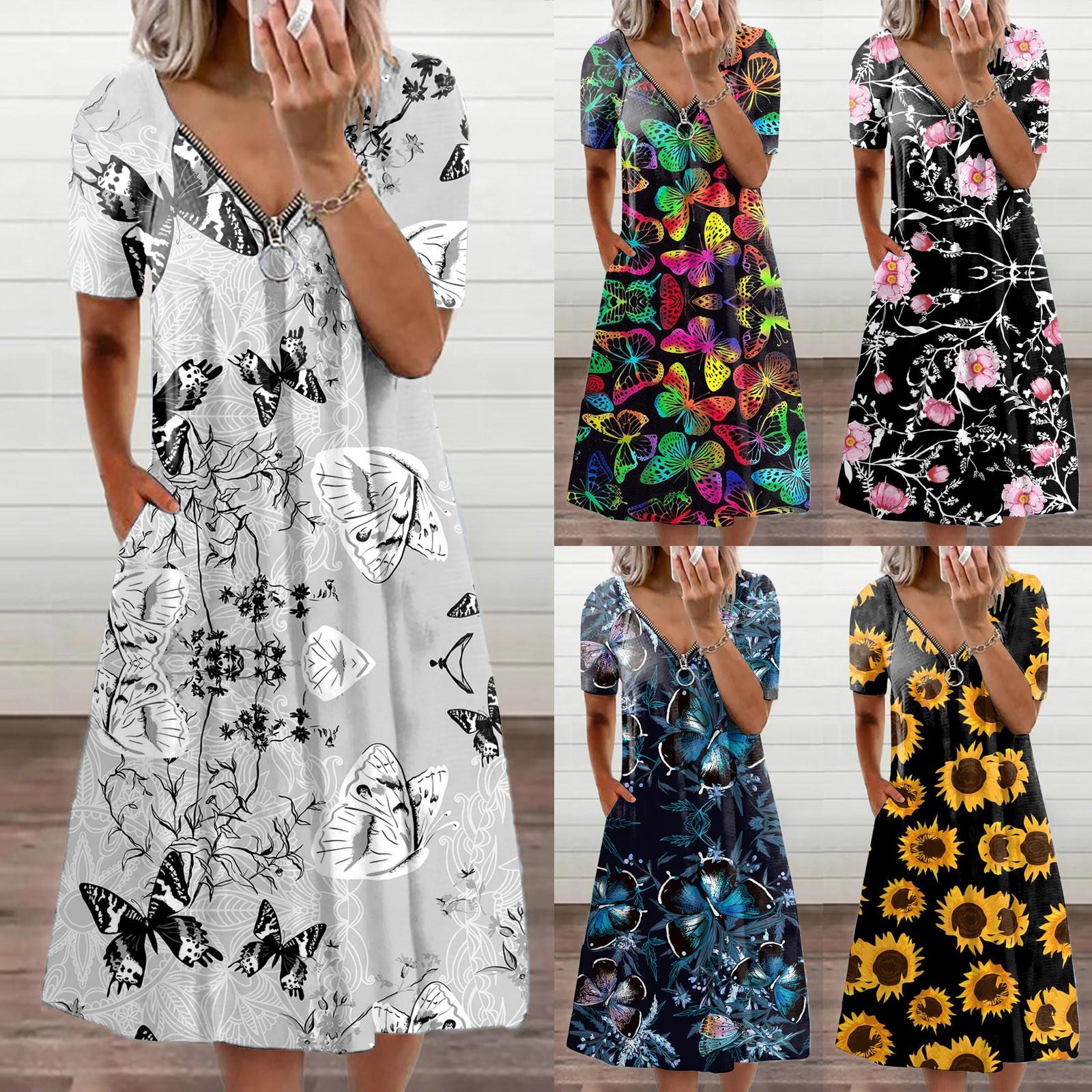 Женское вечернее платье с V-образным вырезом, повседневное свободное платье на молнии с цветочным принтом, сарафан плюс размер