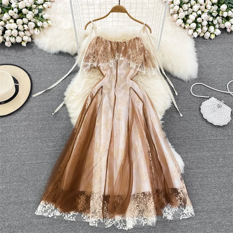 Женское винтажное Сетчатое платье, элегантное контрастное облегающее платье-трапеция с цветочным принтом, открытыми плечами и оборками, дл...