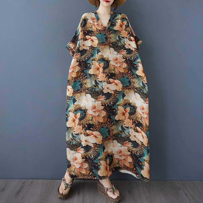 Женское винтажное длинное платье с узорами из хлопка и льна One size