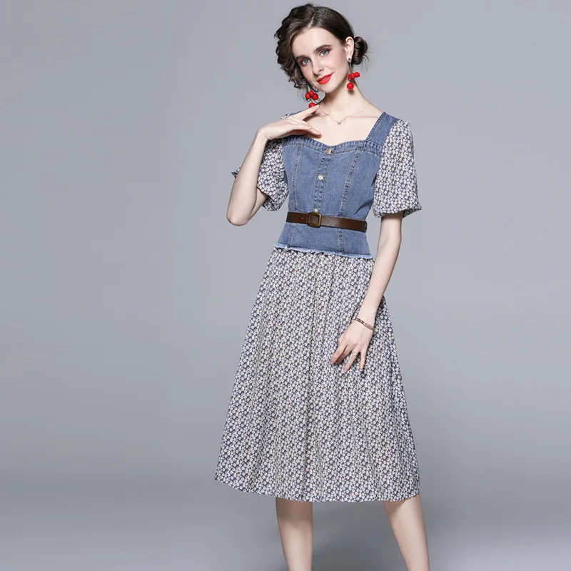 Женское джинсовое платье в стиле пэчворк, Элегантное Длинное облегающее платье-трапеция до колена с цветочным принтом, лето 2022