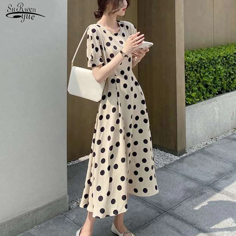 Женское длинное платье в горошек, элегантное свободное праздвечерние чное платье средней длины во французском стиле с высокой талией и кру...