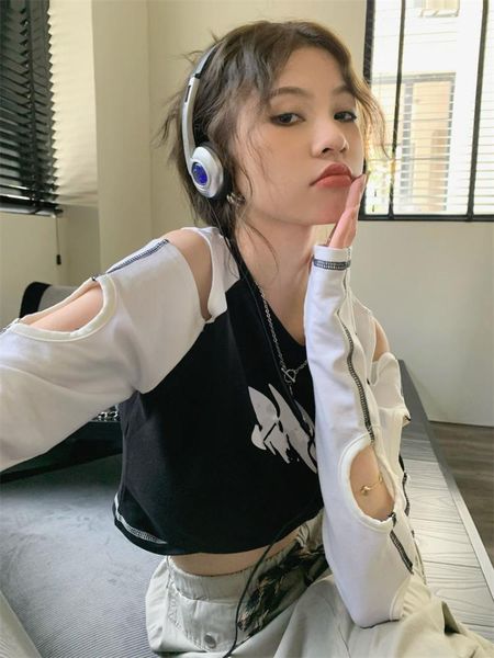 2022 spring dresses autumn crop y2k punk new vintage hole hollow out t shirt off shoulder long sleeve loose print haruku tees, Black