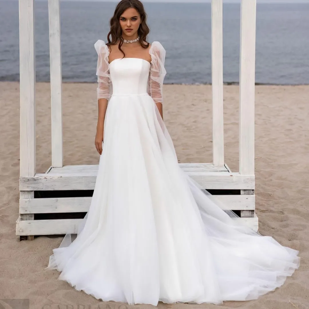 Женское длинное свадебное платье, элегантное Тюлевое ТРАПЕЦИЕВИДНОЕ ПЛАТЬЕ со шлейфом, без бретелек и рукавов, корсет на спине,