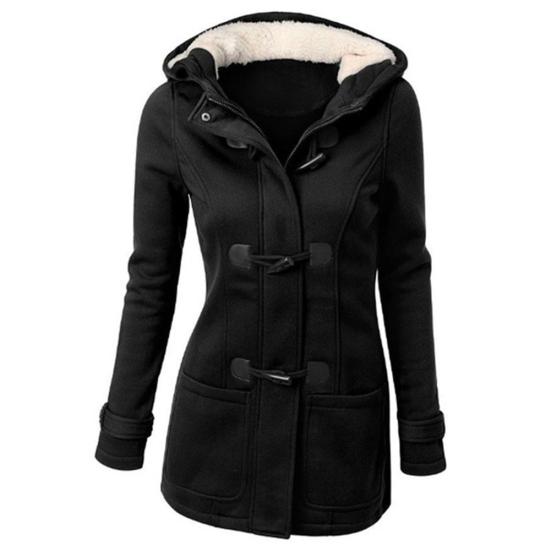 Женское зимнее пальто большого размера однотонное с капюшоном и длинными рукавами, застегивающееся на пуговицы-рожки XXXL чёрный