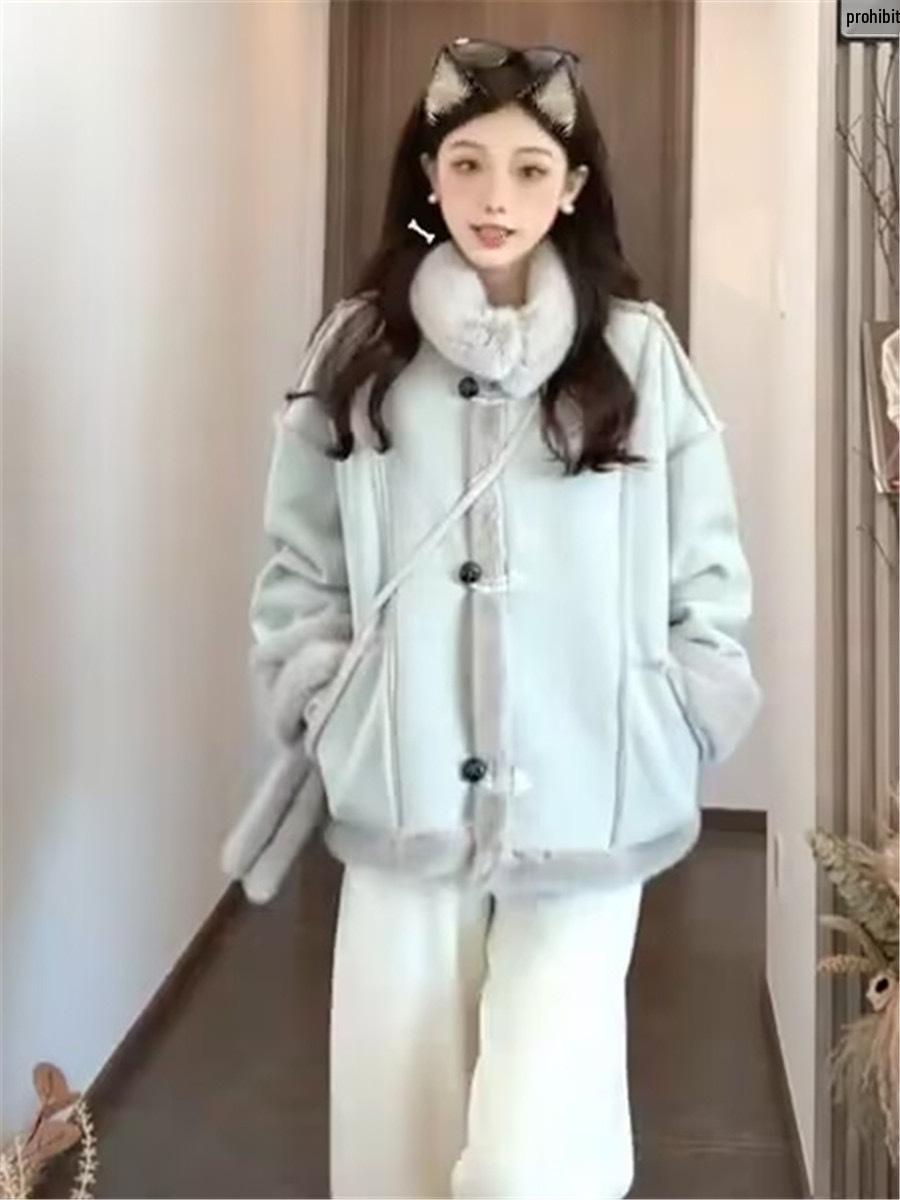Женское зимнее пальто из флиса из овечьей шерсти свободного кроя 2024 Small синий