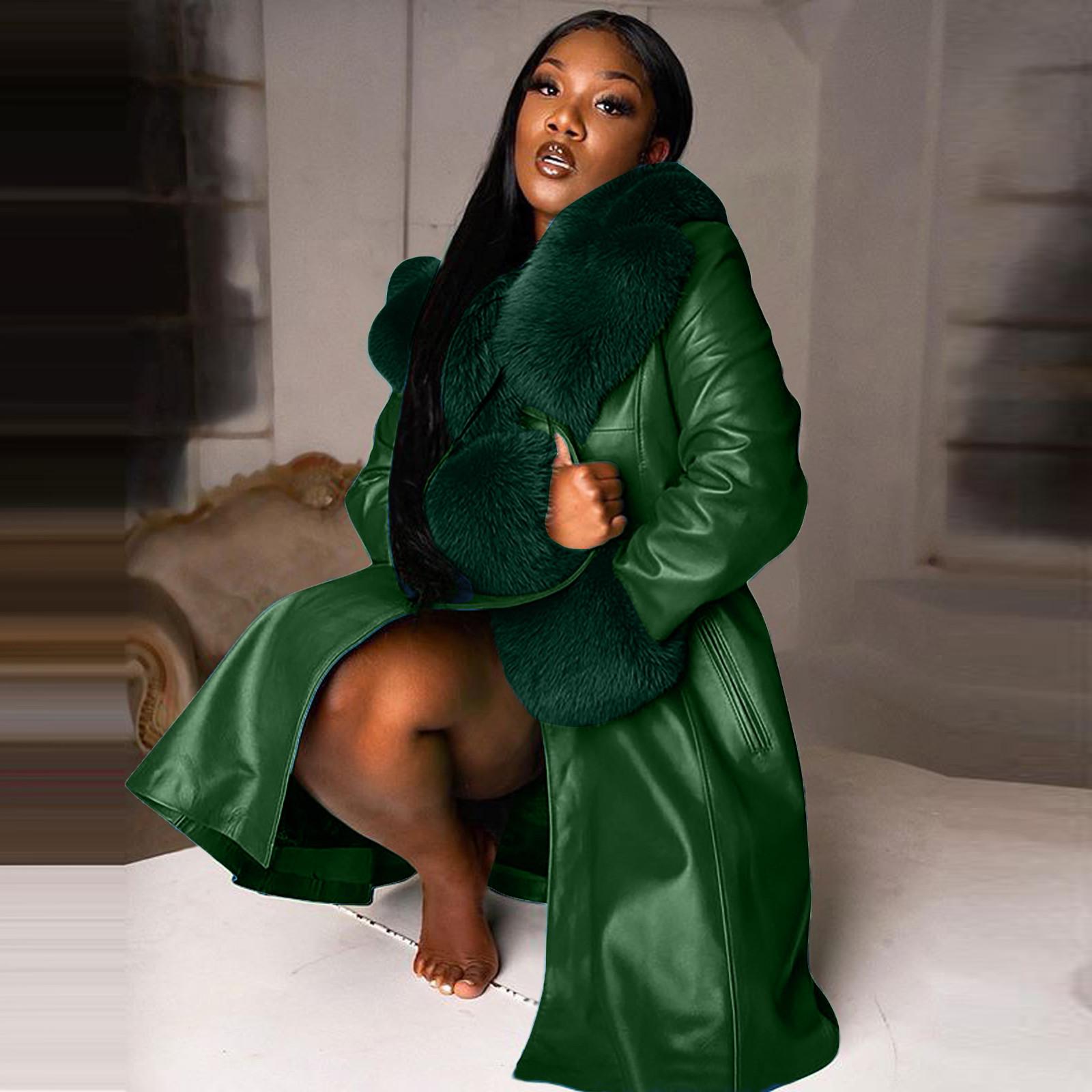 Женское кожаное пальто с воротником, зимняя мода, лацкан с длинным рукавом на молнии, повседневные куртки больших размеров, пальто L зелёный